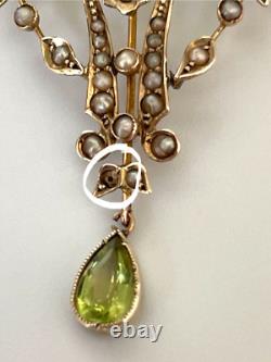 9ct Gold Peridot & Seed Pearl Art Nouveau Lavaliere Pendant/ Brooch. 9ct yellow gold lavaliere pendant or brooch. Set with an oval cut peridot (7mm x 5mm). Pear cut peridot (6mm x 4mm).