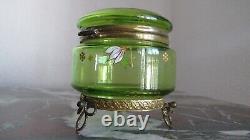 Art Nouveau Green Glass Enamelled Trinket Dresser Box with Ormolu Base Moser