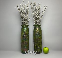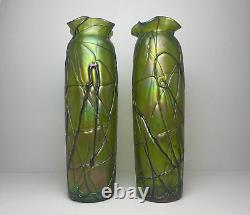 Rare Find, Pair of large Art Nouveau green threaded glass Vases Attributed To Pallme-König. Amazing opportunity to own museum quality glass ware, stunning vibrancy and iridescent finish. Fantastic condition, no chips or cracks to glass. Height 39 x Width 11.5 cm each.