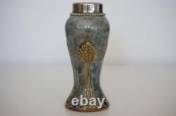 An antique Royal Doulton Lambeth Art Nouveau vase with a stylised wheat design surrounding the main body and a hallmarked silver rim - Royal Doulton Lambeth impressed mark to the base. Hallmarked rim for Chester 1916-17. Royal Doulton Lambeth Art Nouveau Vase - Stylised Wheat Design - Silver Rim - c.